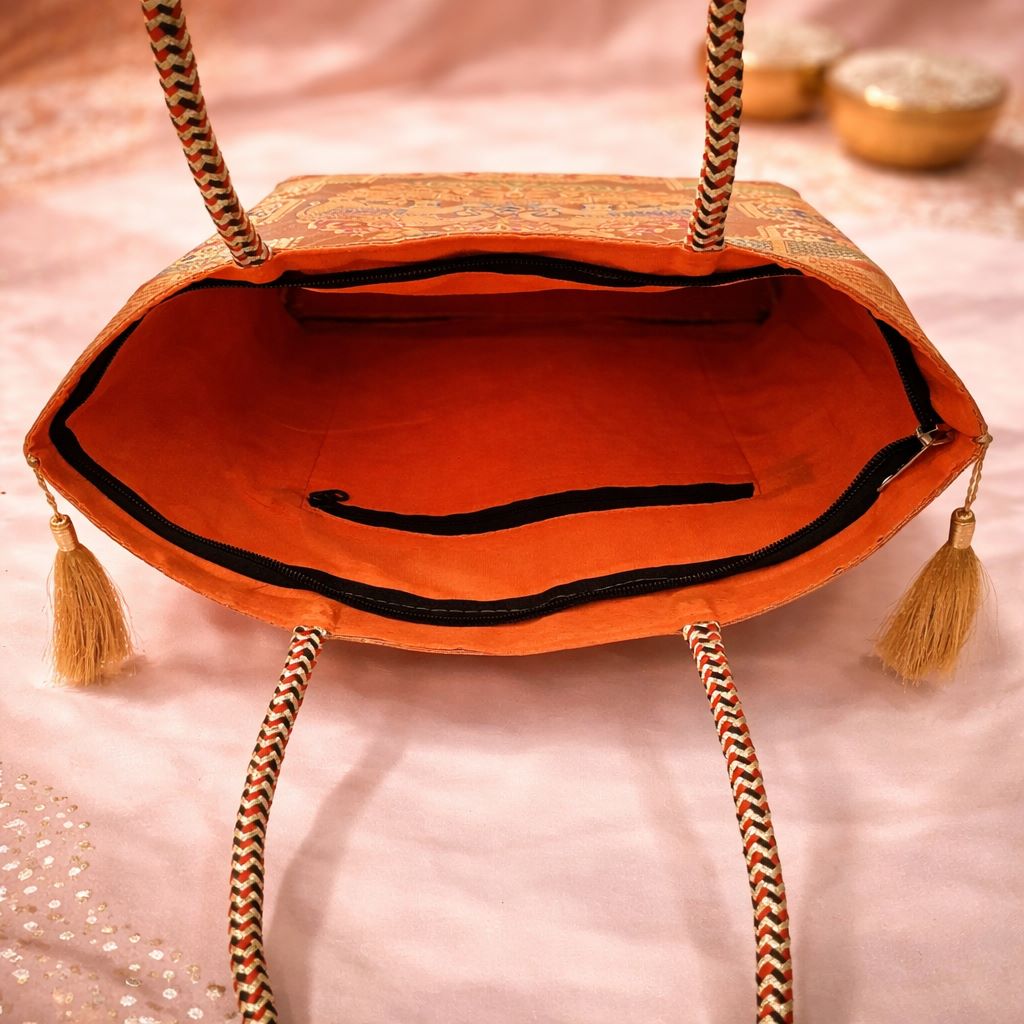 This handbag is designed with a spacious main compartment secured by a smooth top zip closure. Inside, matching color lining fabric is used along with one inner zip pocket for convenient organization of essentials. The main zip is finished with two decorative golden zari tassels on both ends, enhancing the classic ethnic appeal of the bag.